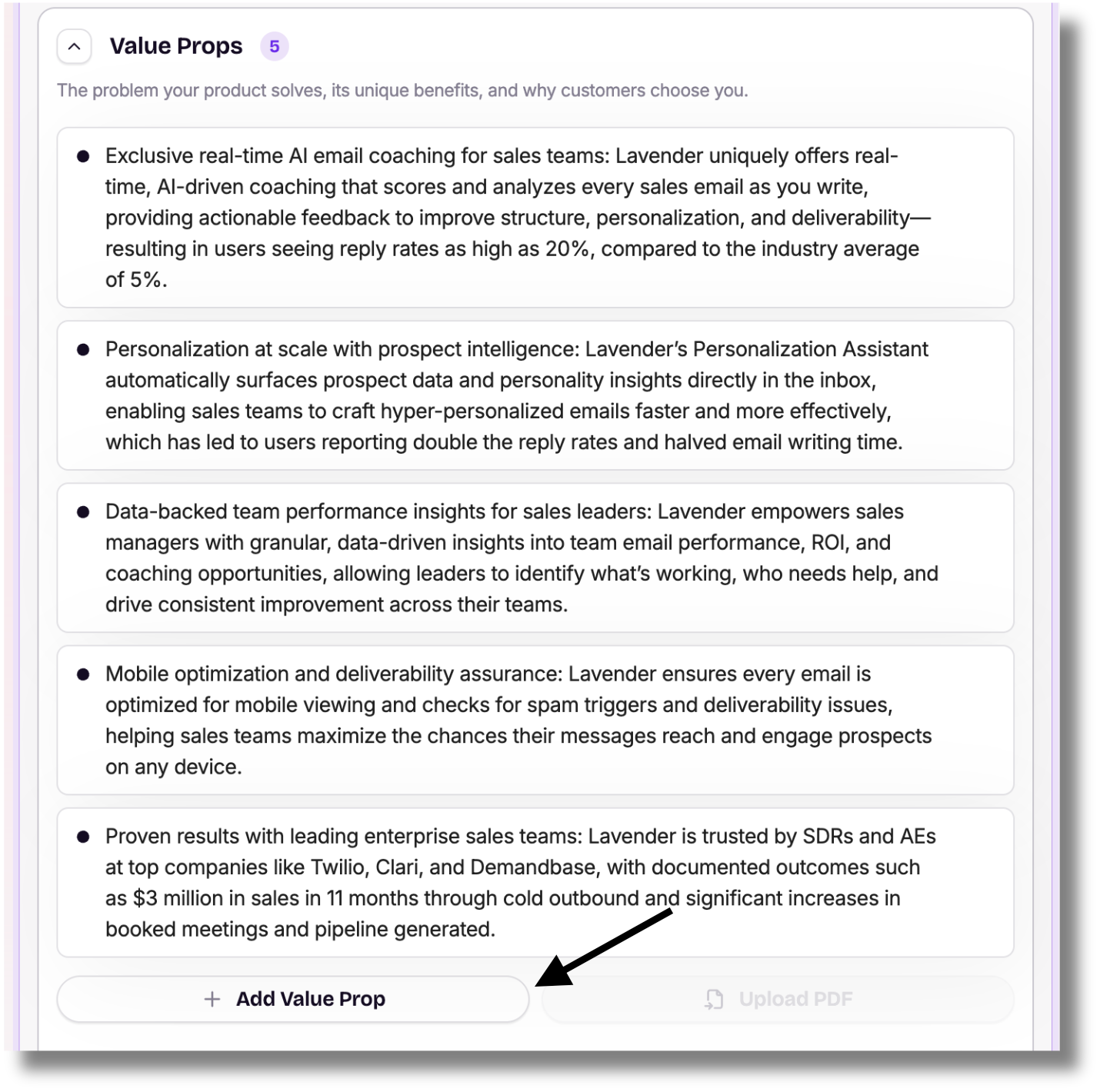 Value Props drive a significant portion of how your agent processes research and crafts messaging. The more clear and specific these are, the better your output will be.