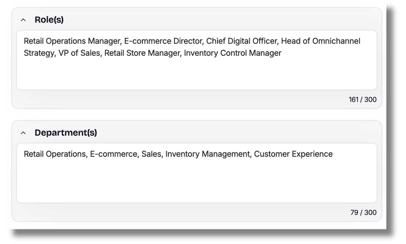 ⚠️ These must align with your lead list, if you say "CFOs" but upload marketers, Ora won't match the leads.