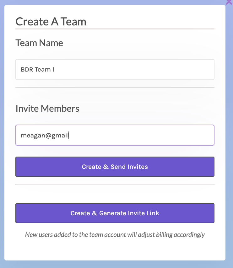 From here, add your team name and fill in the email addresses for your team members. This will generate email invitations that will be sent to them, encouraging them to set up an account with Lavender!