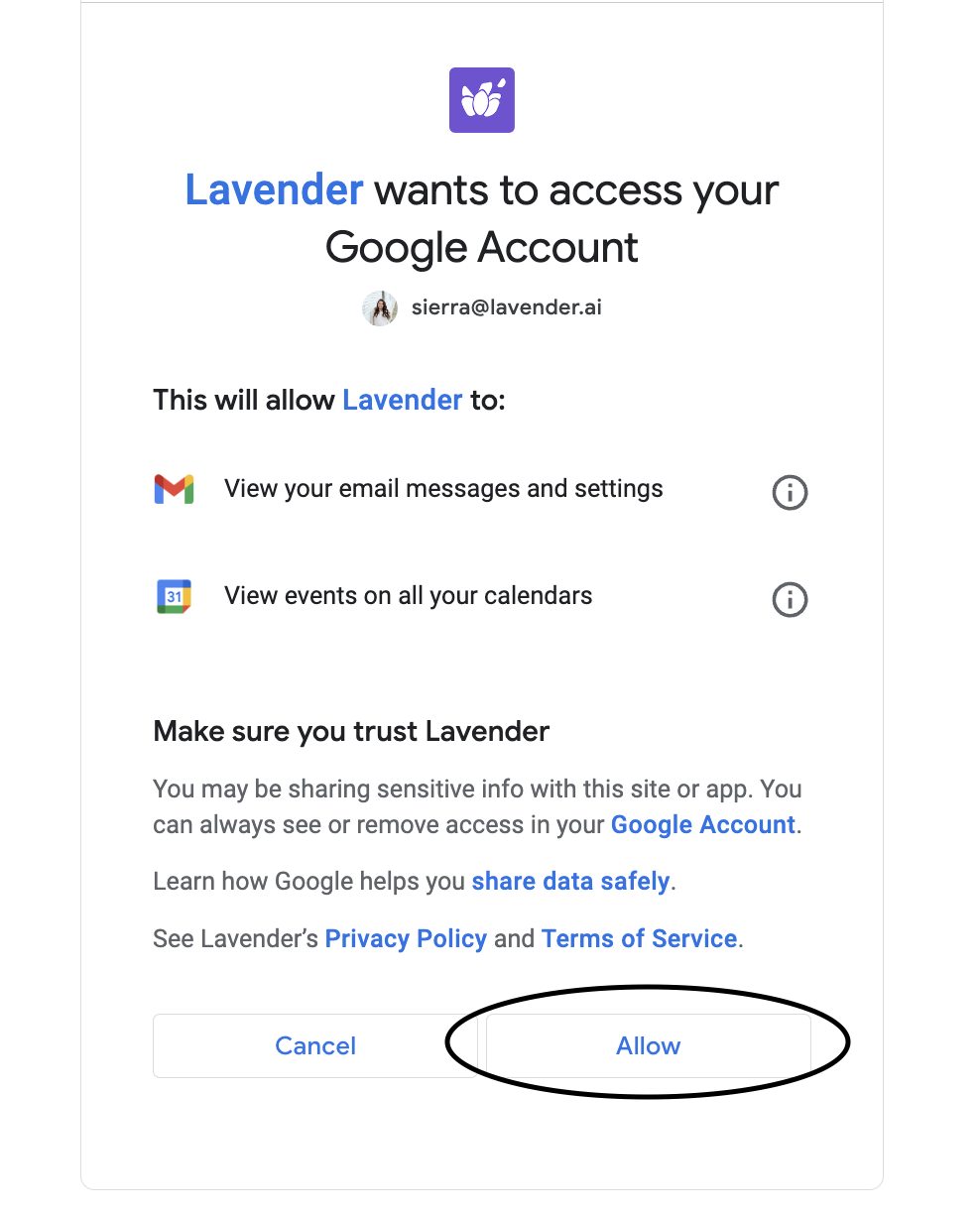 - After clicking the "Connect to Google" button, a pop-up window will appear, asking for permission to access your Gmail data. Click on "Allow" to permit Lavender.